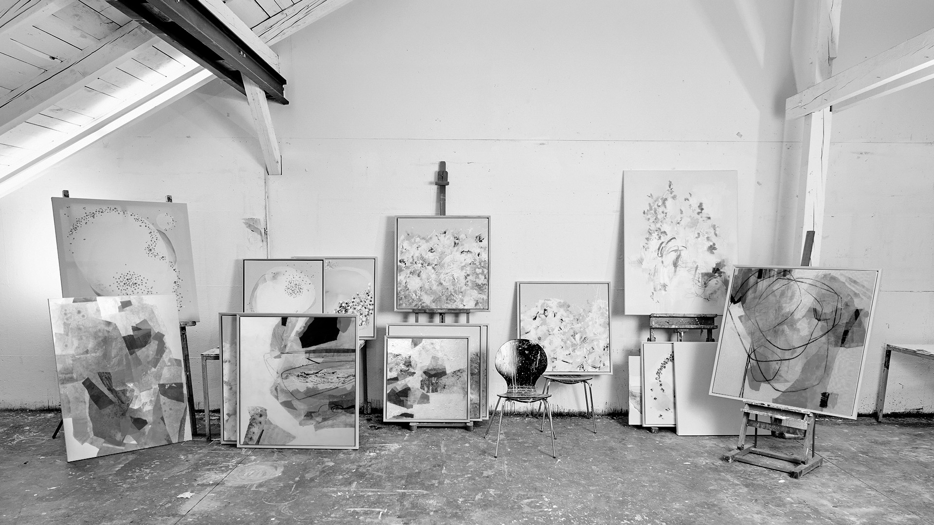 Der Zufall spielt darin eine feste Rolle: Er lässt ihn zu, lenkt ihn, ohne ihn vollständig zu kontrollieren. Risse im Papier, Überlagerungen oder fließende Farbverläufe versteht er nicht als Störungen, sondern als Impulse, auf die er reagiert. Entscheidend ist dabei das innere Gleichgewicht. Jedes Werk findet seine Balance – zwischen Hell und Dunkel, Fläche und Linie, Spannung und Ruhe. Kein Element darf überwiegen, alles steht in Beziehung zueinander.