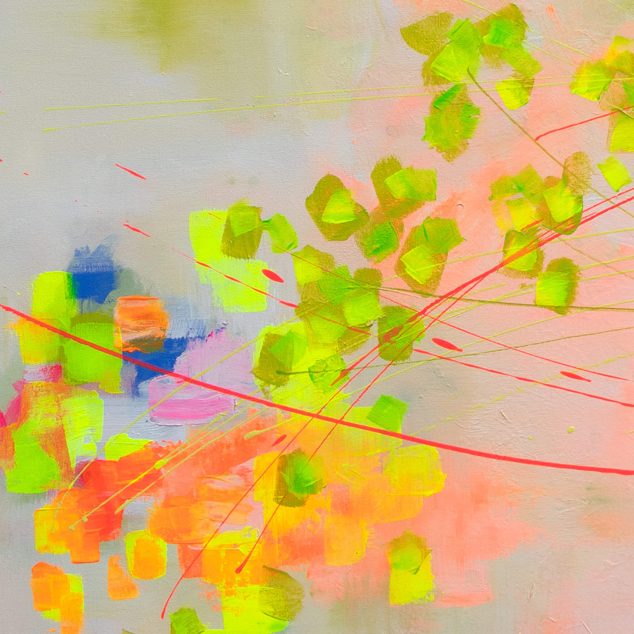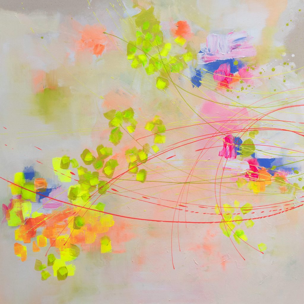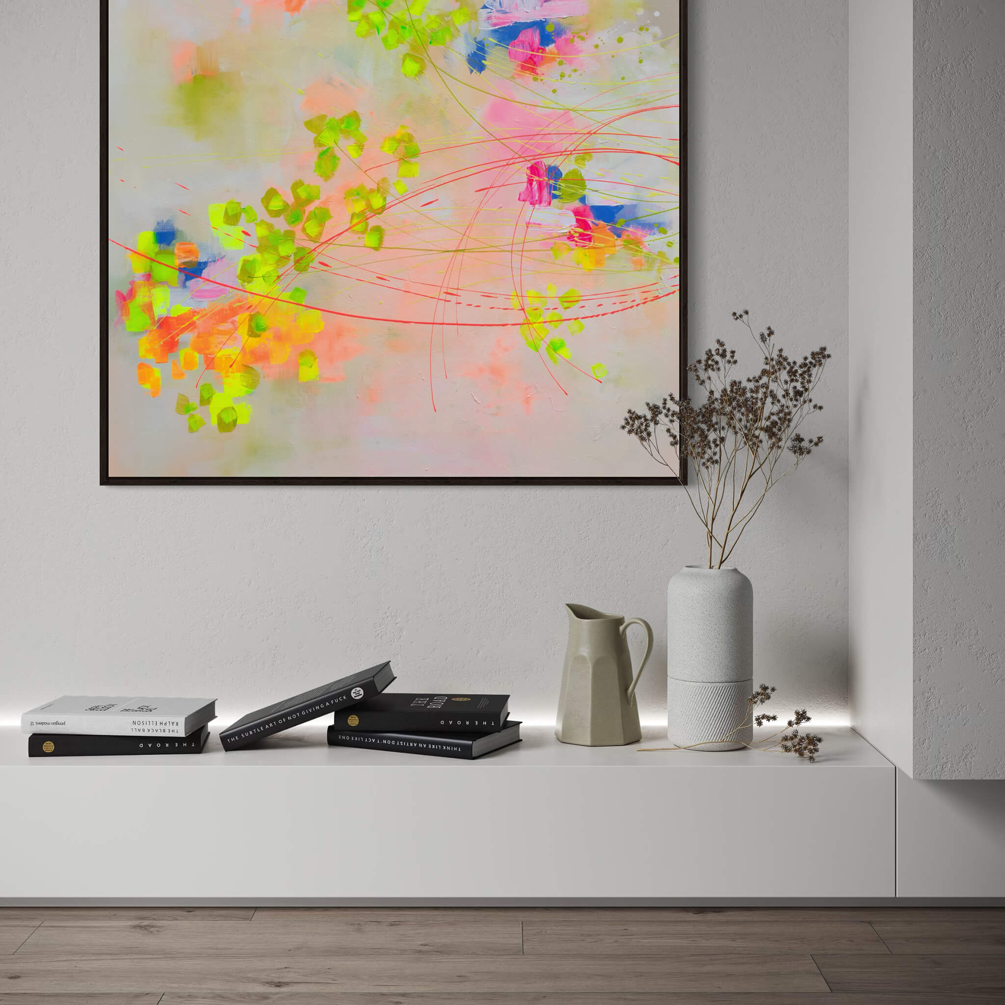 Meine Arbeiten entstehen auf roher Leinwand – ein bewusster, offener Malgrund, der die Farben atmen lässt. Mit Acrylfarben, Pastellkreiden und leuchtenden Neonakzenten interpretiere ich die Natur in abstrakter Form. Oft denke ich dabei an Blumenwiesen oder Landschaften, nicht als konkrete Abbildungen, sondern als Stimmungen und Energien. Die Malerei wird für mich zum Versuch, das Lebendige, Flüchtige und Wilde der Natur in Farbe und Bewegung einzufangen.