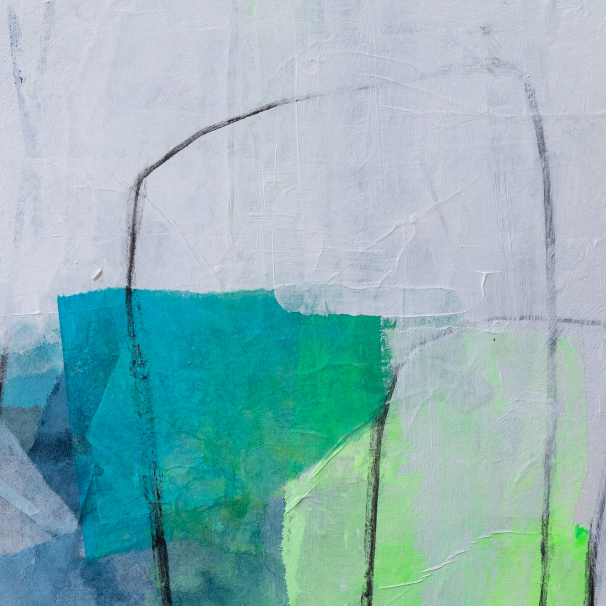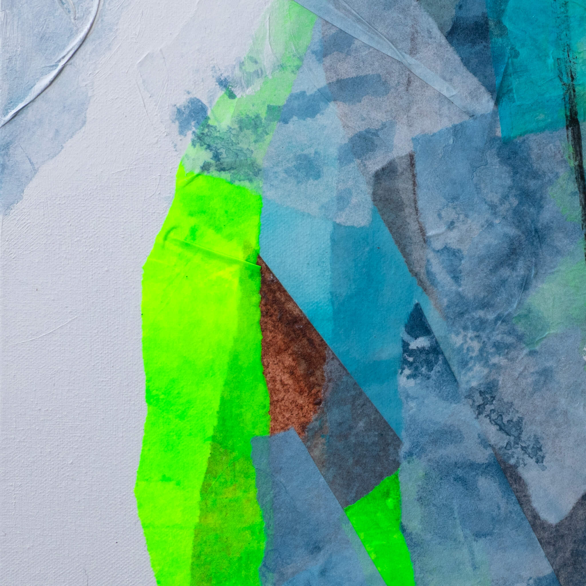 Das Werk „Ecken und Kanten No. 3“ ist eine schöne kleine Collage aus Chinapapieren im Format (40 × 40 cm) auf Leinwand. Der Bildgrund wurde mit einer Marmormehl-Struktur versehen und in mehreren Schichten Weiß übermalt, wobei die reliefartige Oberfläche weiterhin deutlich sichtbar bleibt. Ergänzt wird dies durch farbige Papierfragmente aus vielfach geschichtetem, von mir eingefärbtem Chinapapier, die sich zu einer ausgewogenen, vielschichtigen Komposition verbinden.