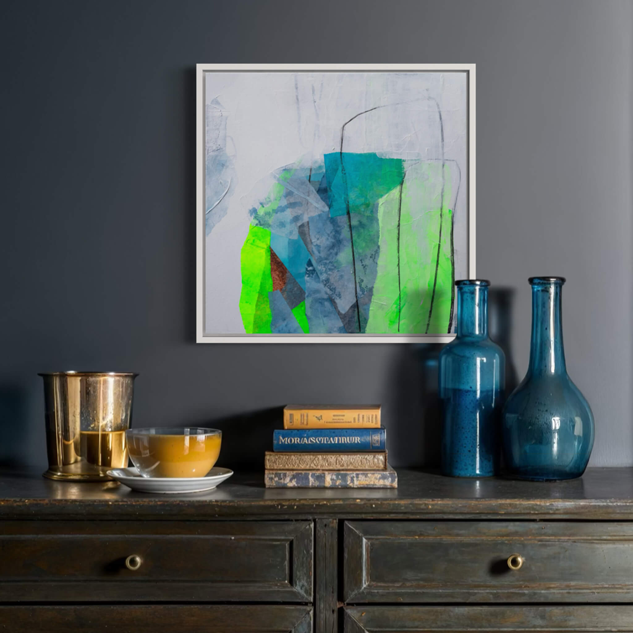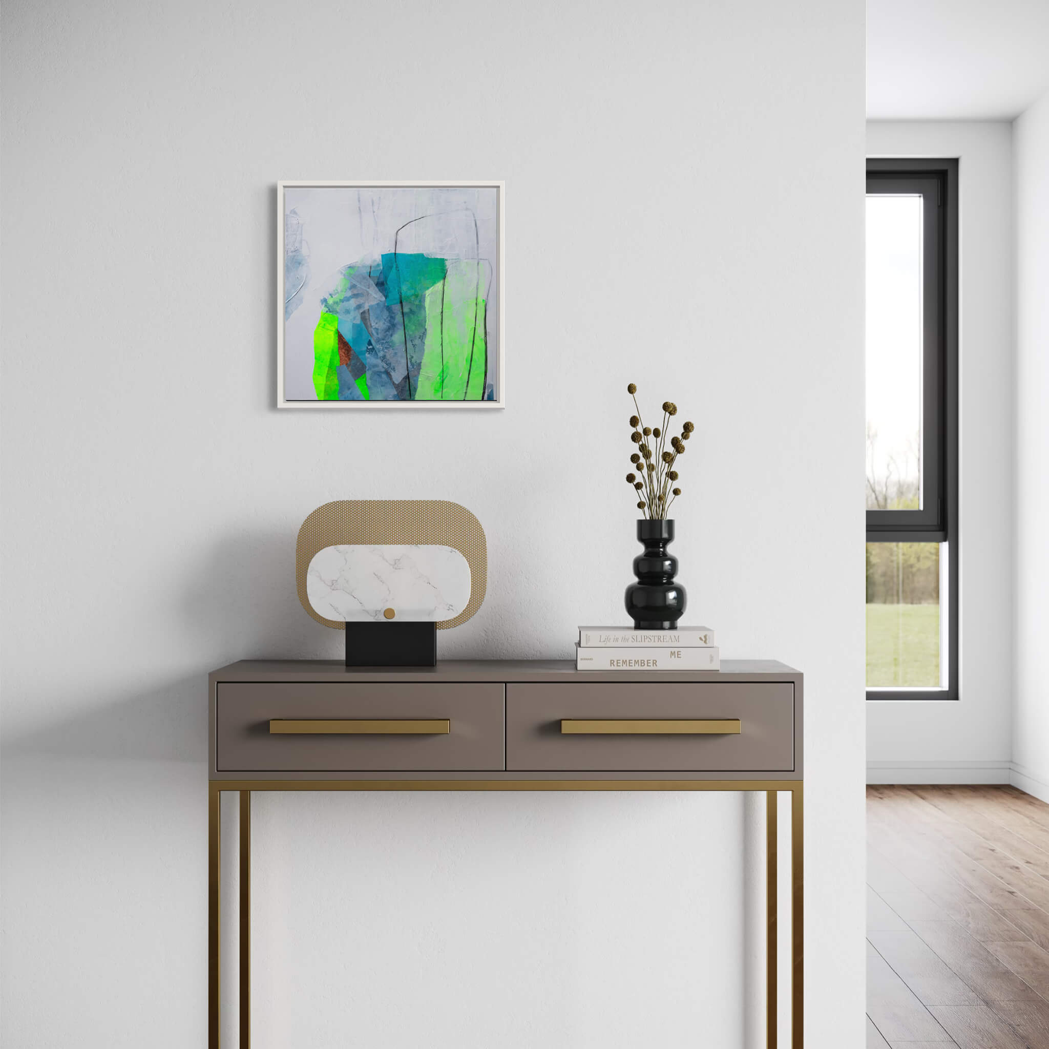 Leben Sie weiter entfernt, können Sie mir auch ein Foto Ihrer Wand mit den genauen Maßen zusenden. Ich simuliere das ausgewählte Werk anschließend virtuell in Ihrem Raum, sodass Sie leichter erkennen, ob es mit Ihrer Einrichtung harmoniert. Nutzen Sie dafür einfach das Kontaktformular – ich unterstütze Sie gerne bei der Auswahl.