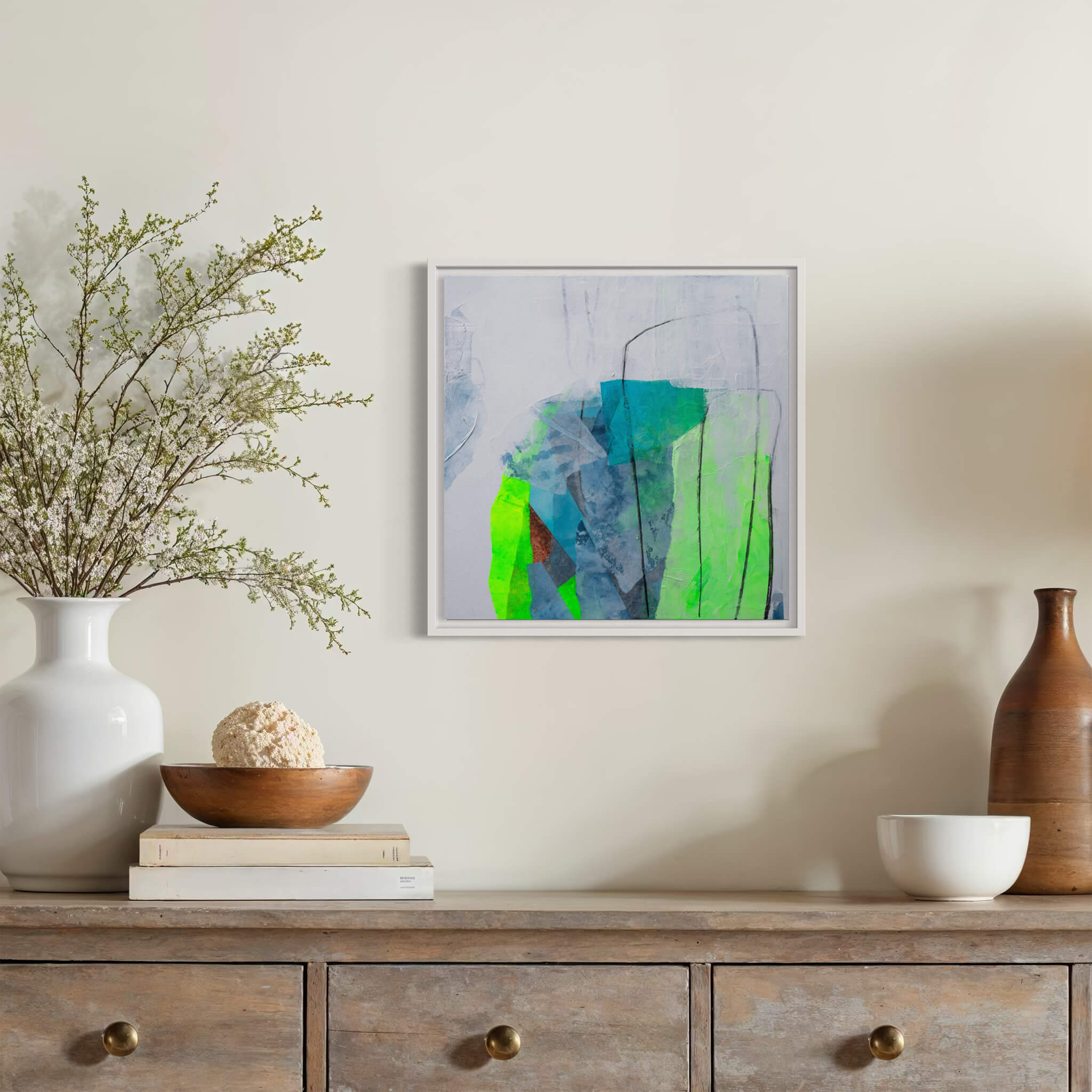Das Gemälde ist Teil der Serie „Ecken und Kanten“, weiß gerahmt und fertig zum Aufhängen.