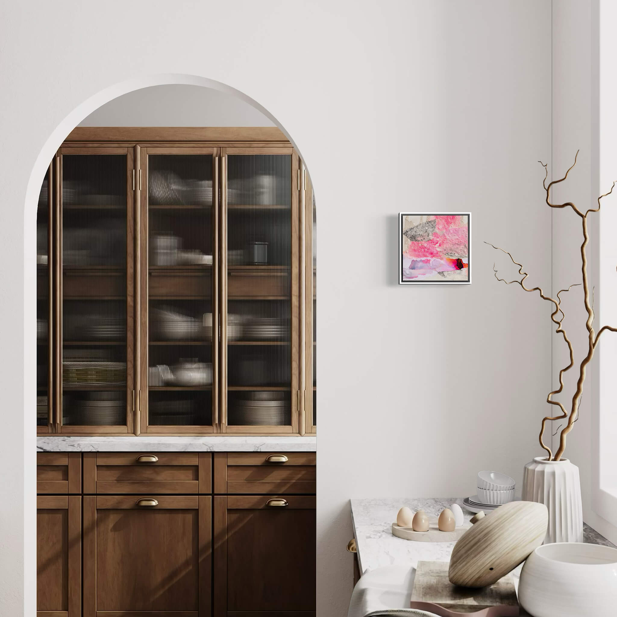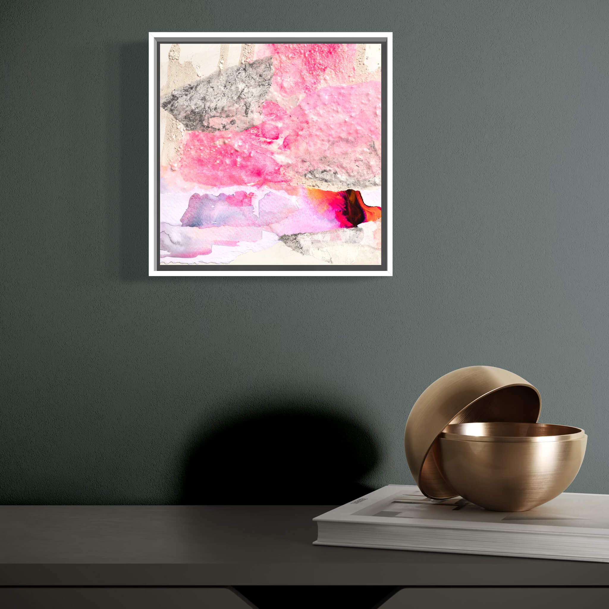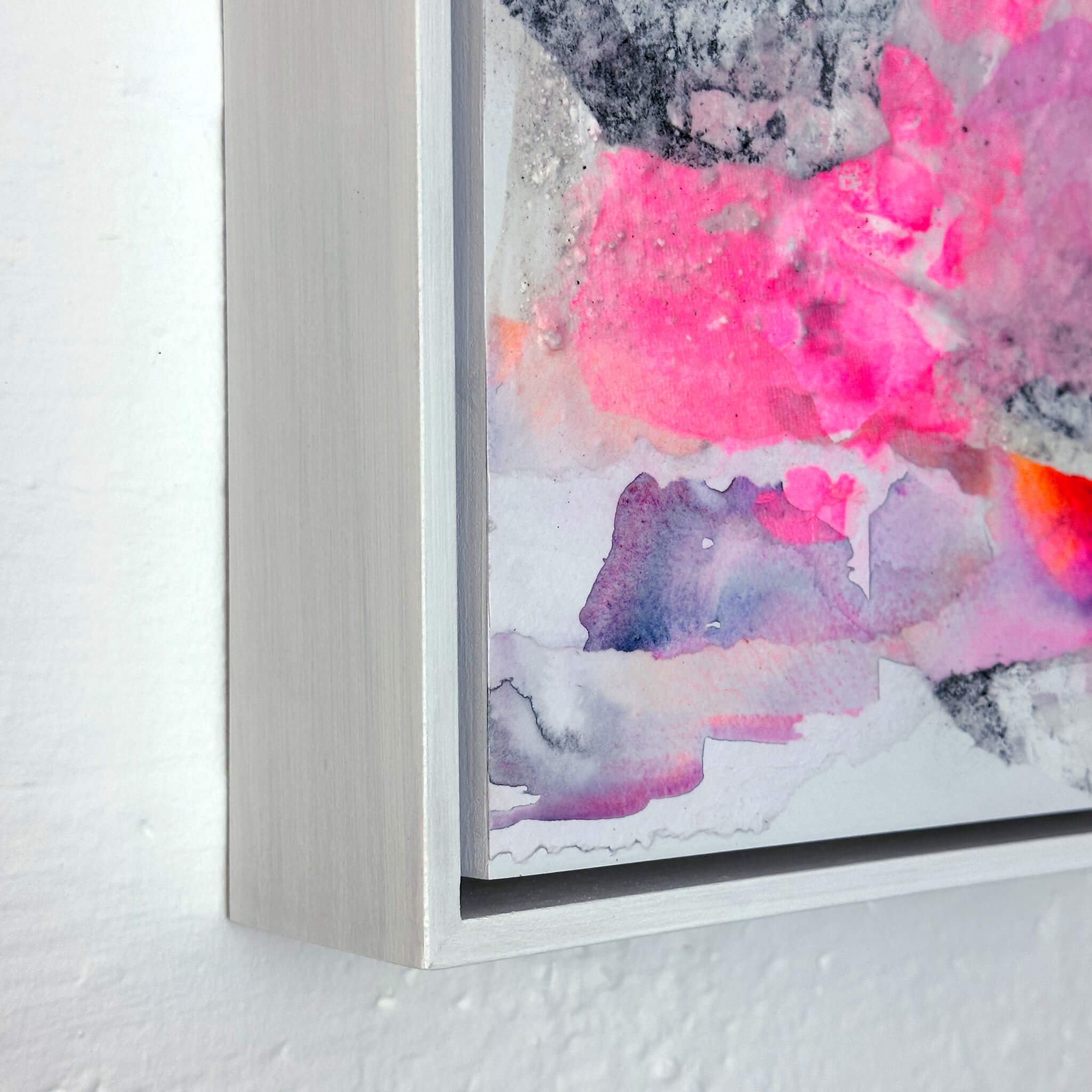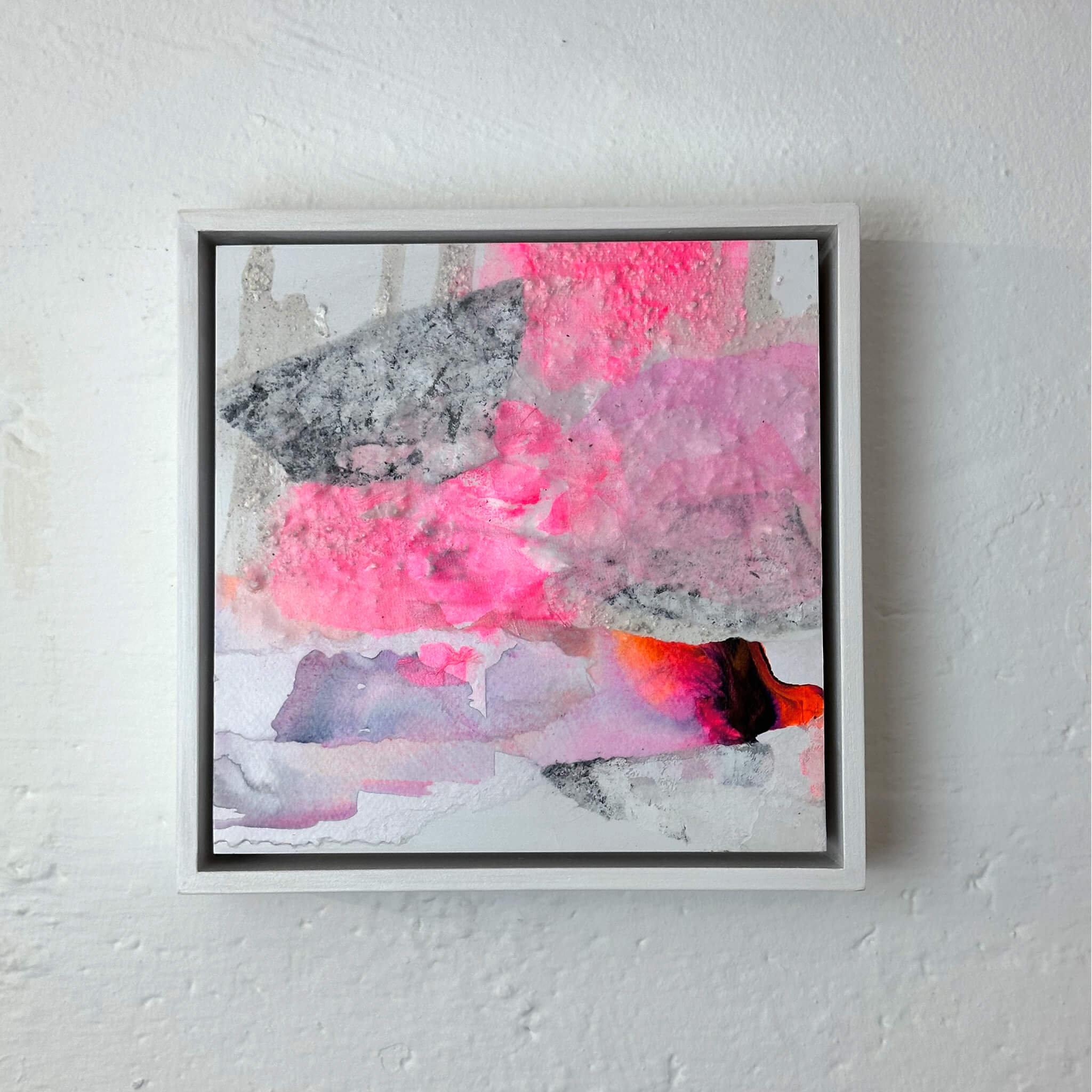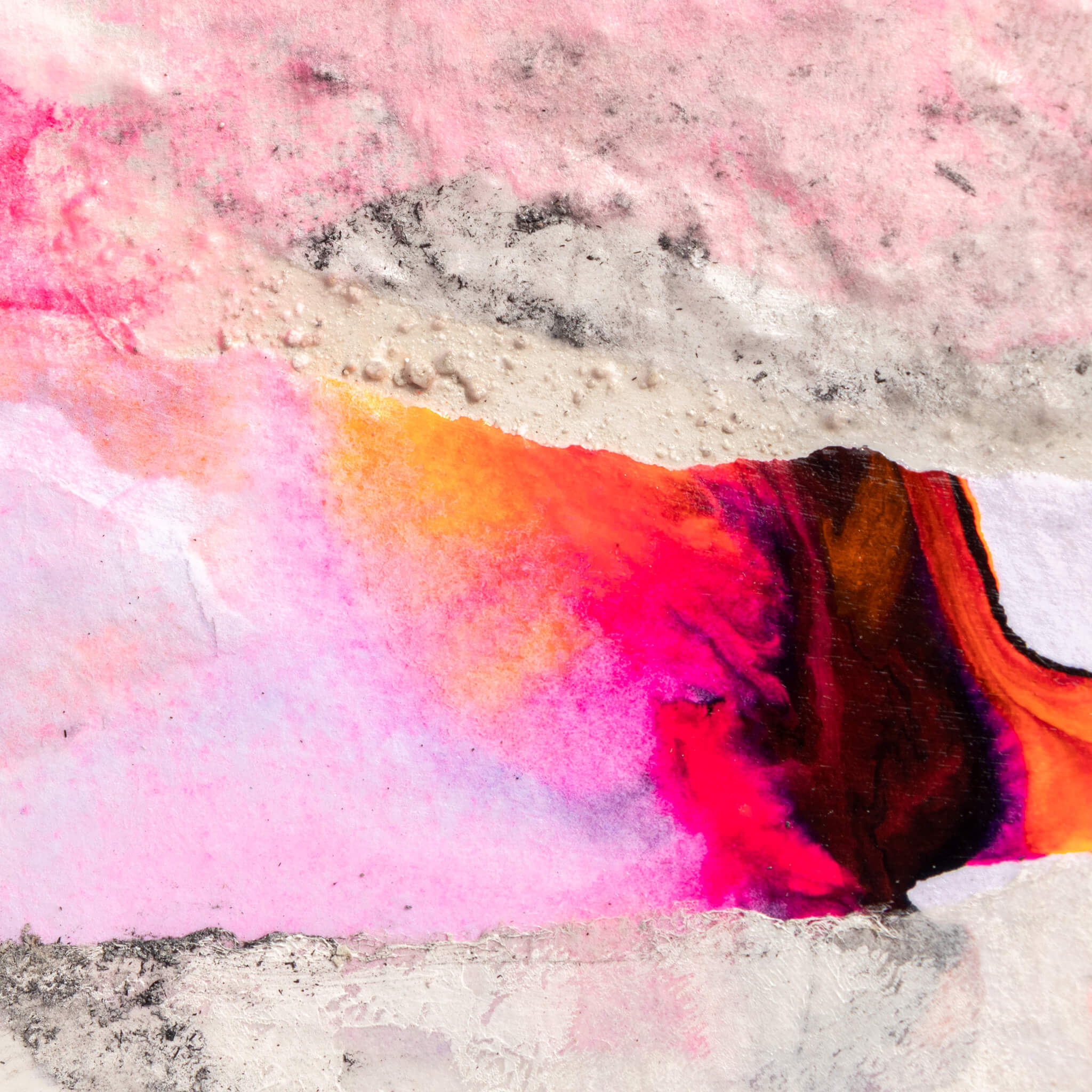 Das Werk im kompakten Format von 20×20×5 cm ist eine Collage aus Chinapapier auf Holz. Sämtliche Papiere wurden im Vorfeld sorgfältig mit verschiedenen rosa- und pinkfarbenen Pigmenten eingefärbt. Einen spannungsvollen Kontrast dazu bilden die dunklen Flächen aus Lavagestein. Dieses wurde aufwendig zerkleinert, fein zermahlen und anschließend mithilfe eines Bindemittels auf den Papieren fixiert. So entsteht ein harmonisches Gesamtbild, das zugleich Fragilität und Stärke in sich vereint. Die unterschiedlichen Flächen erzeugen einen kraftvollen Kontrast. Gleichzeitig sind sie aufeinander angewiesen, um ihre volle Wirkung und Schönheit zu entfalten.