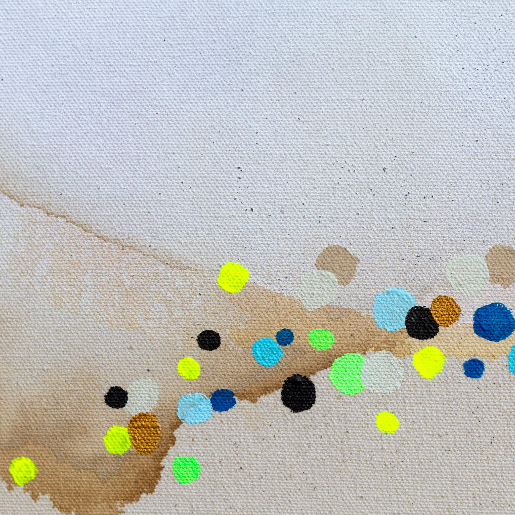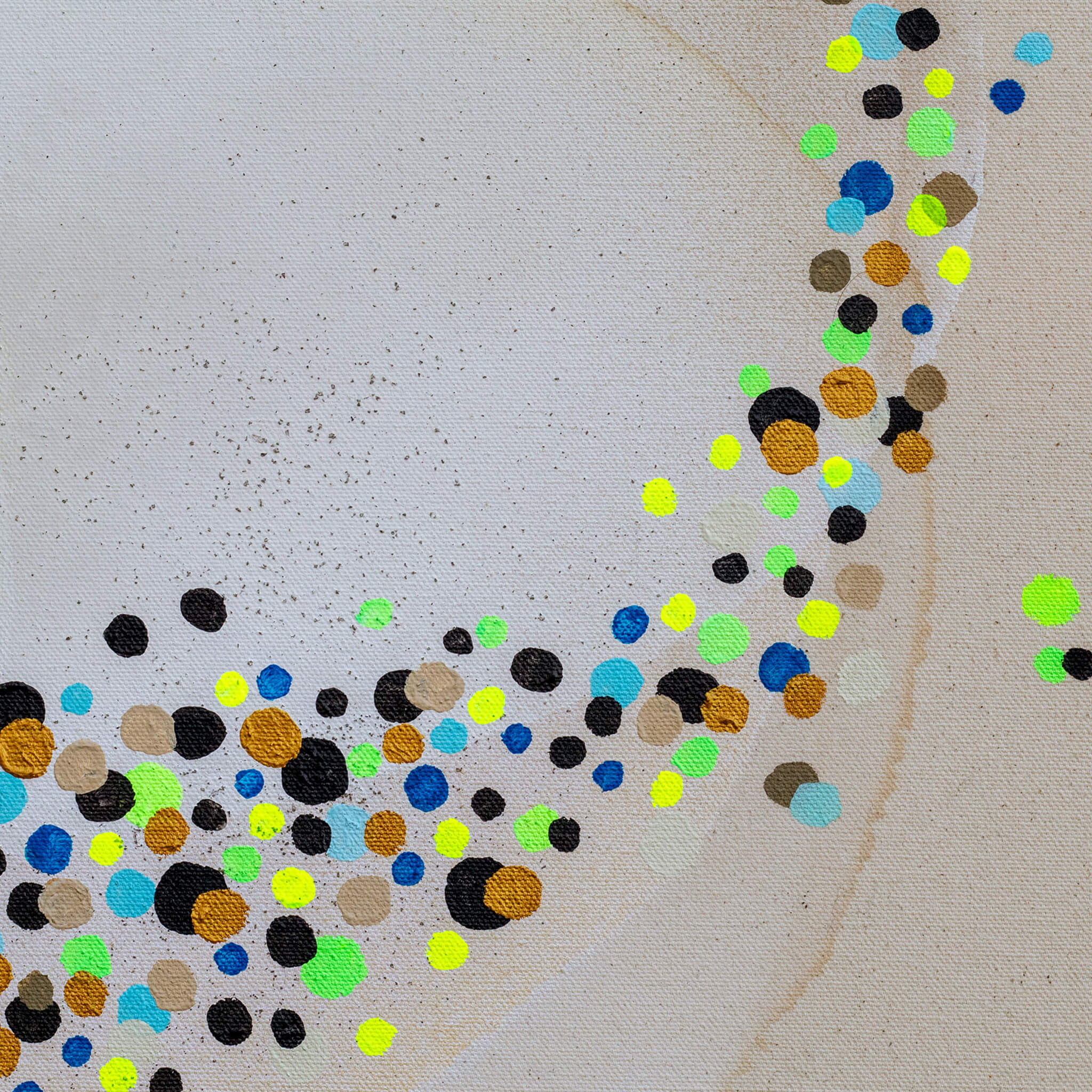 Leuchtende Farbpunkte brechen durch die Ruhe. Jeder einzelne bewusst gesetzt – und doch wirken sie wie Impulse, die sich Bahn brechen. Sie stehen für Endorphine, für Energie, für genau diesen Moment, in dem ein Gedanke laut wird. Zu laut, um in der eigenen Blase zu bleiben.