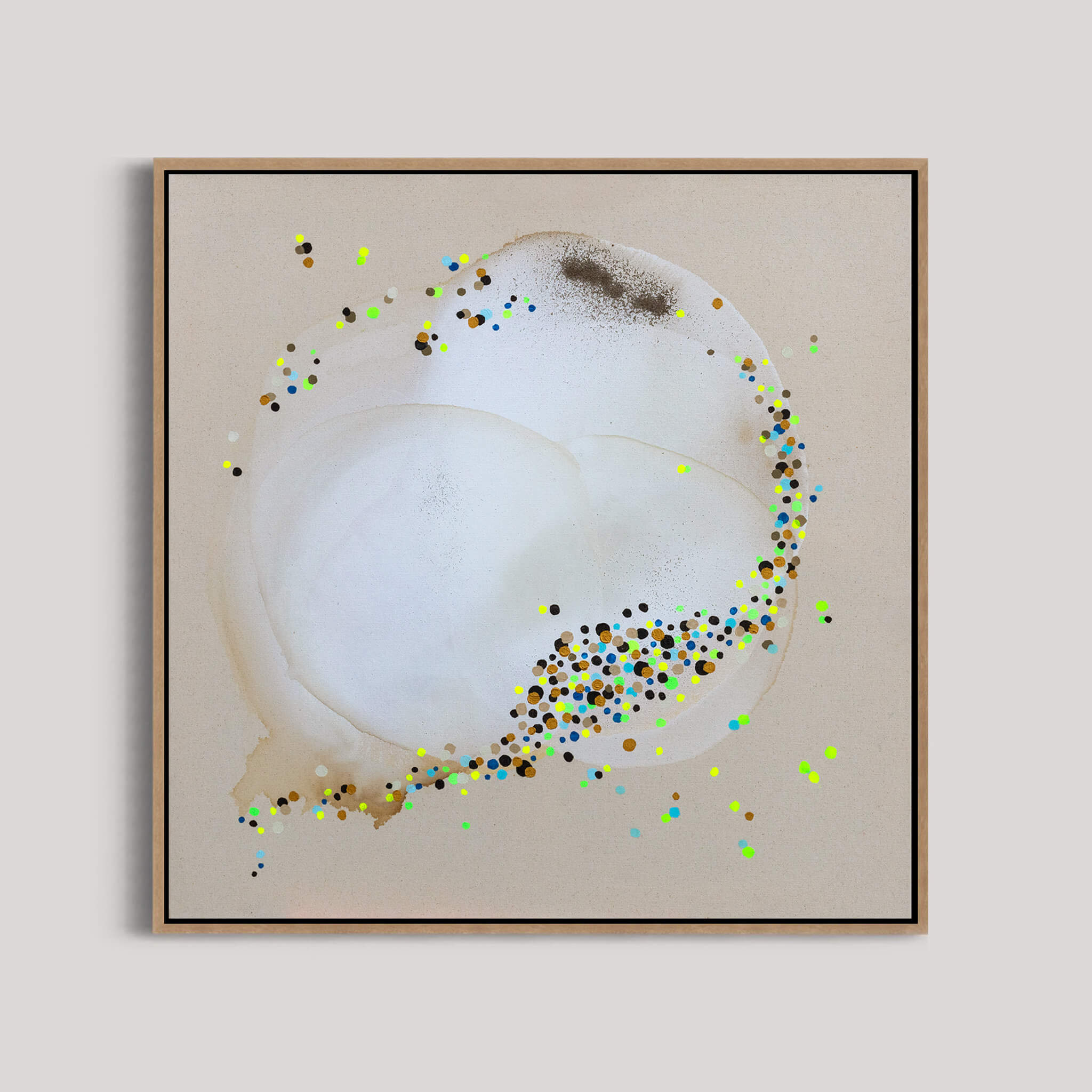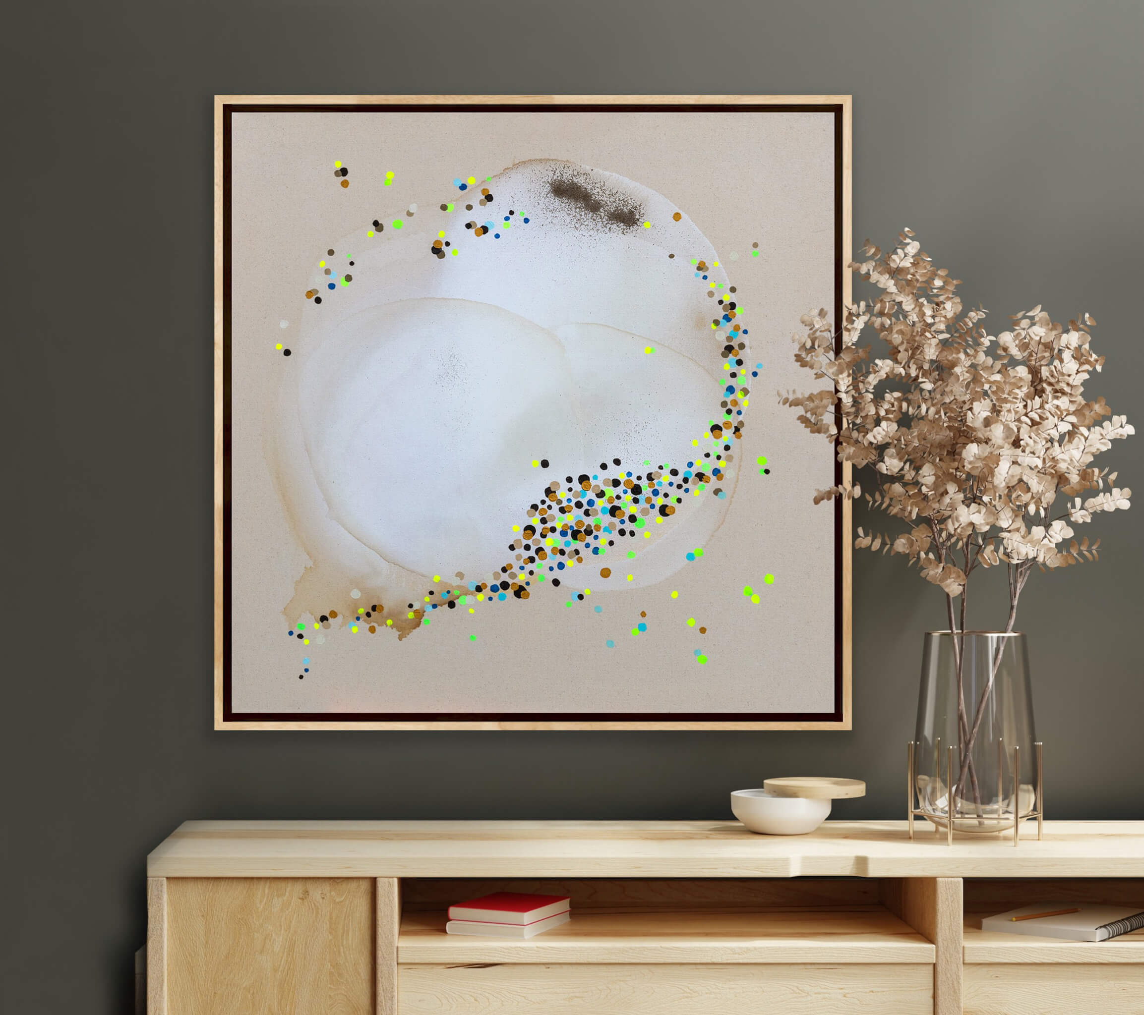 Das Gemälde ist in Naturholz gerahmt und fertig zum Aufhängen. Der schwarze Schattenfugenrahmen bildet dabei einen eleganten Kontrast, der die Wertigkeit des Werkes unterstreicht und seine Ausstrahlung verstärkt. Gemeinsam mit der unbehandelten Leinwand und dem Naturholzrahmen entsteht so eine stimmige Gesamtheit, die Natürlichkeit und Raffinesse verbindet.