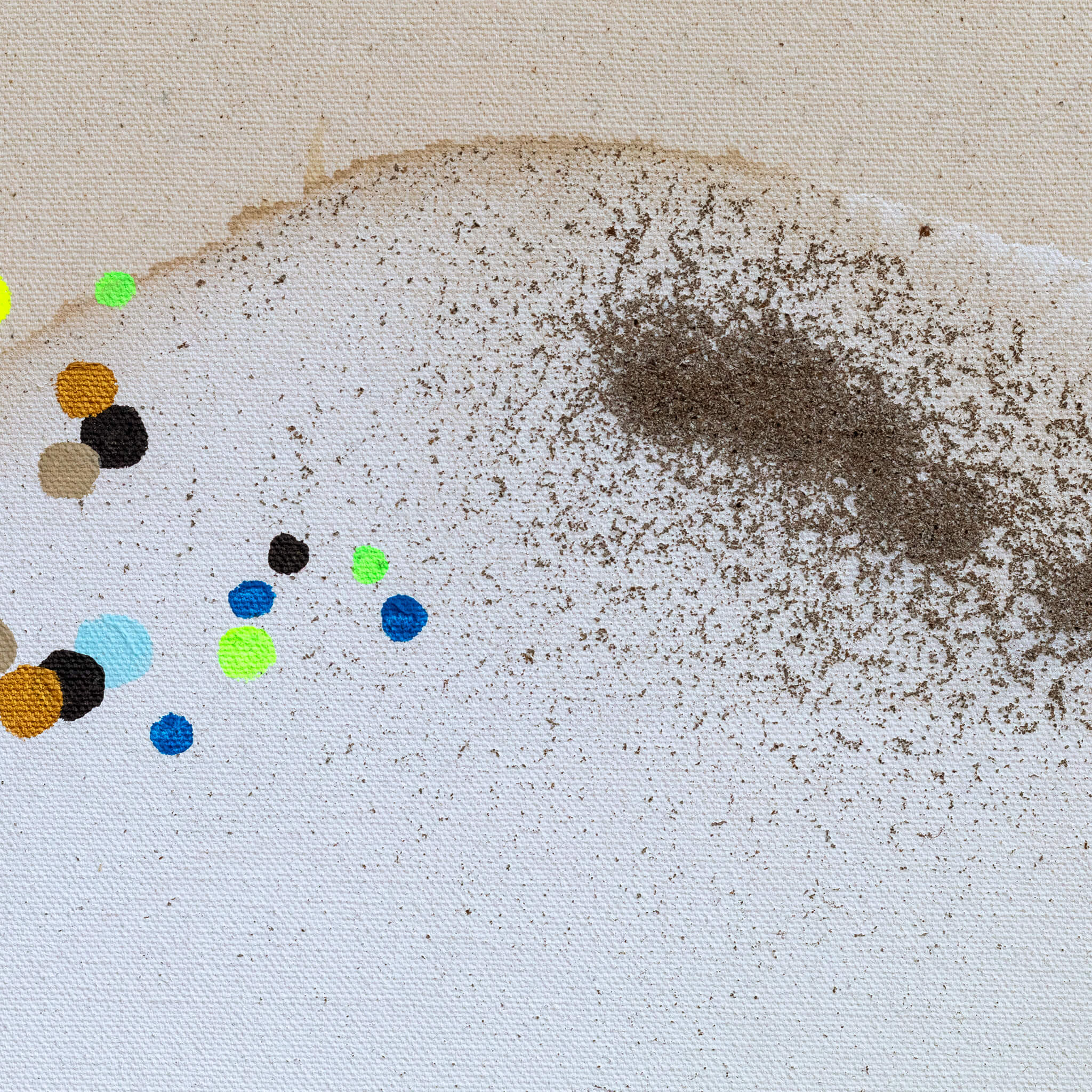 Schicht um Schicht legt sich Weiß darüber. Es beruhigt – scheinbar. Gleichzeitig verdichtet es die Oberfläche, lässt etwas entstehen, das wirkt, als würde es schweben und sich zugleich aufladen. Dazwischen: Kaffee. Flüssig, fleckig, unkontrollierbar. Und Kaffeepulver, das sich nicht einordnen lässt, sondern eigene Wege geht. Wie Gedanken, die plötzlich auftauchen, sich festsetzen, ausfransen.