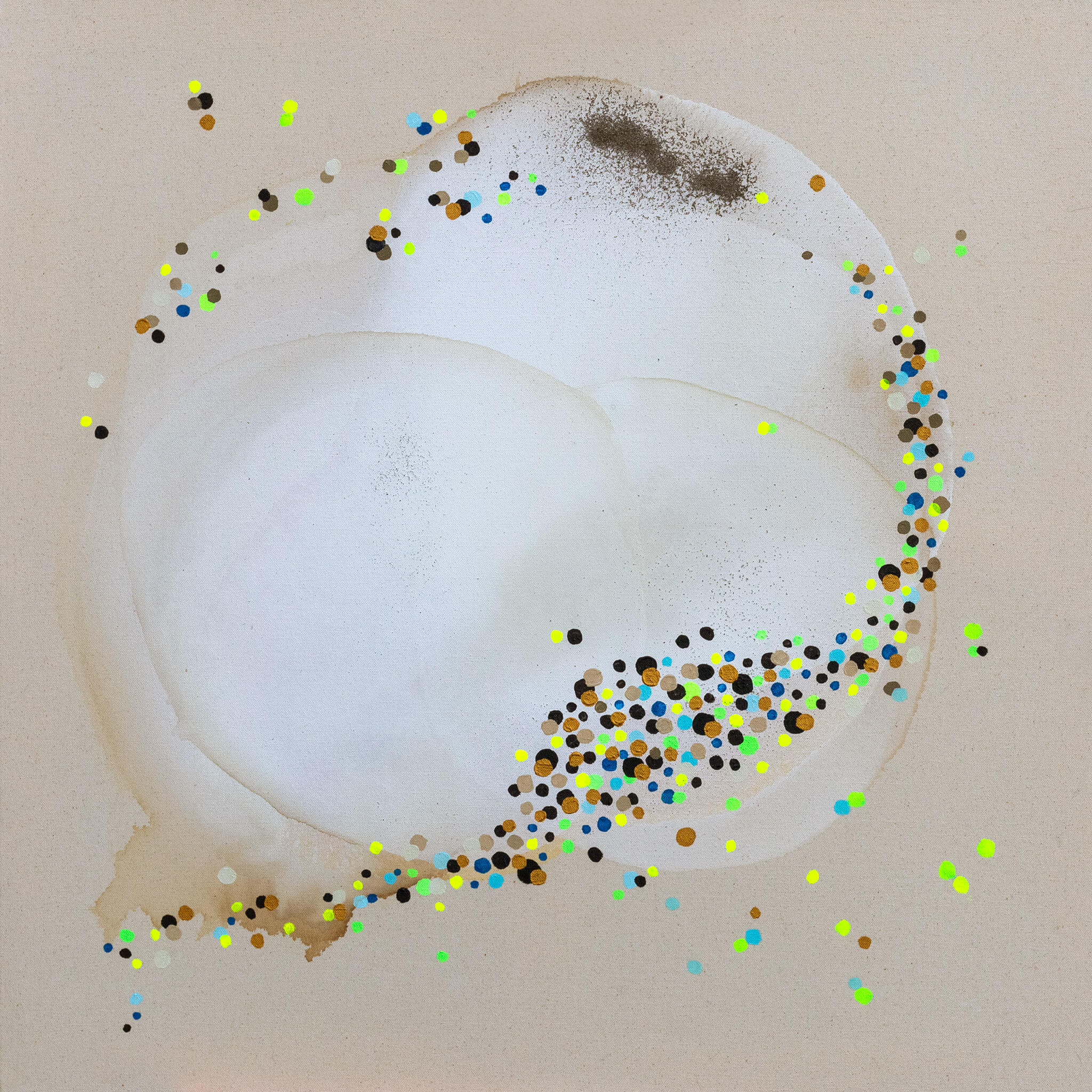 Das Werk gehört zu meiner Serie Out of the Bubble und beginnt dort, wo Gedanken noch ungefiltert sind: auf der rohen Leinwand. Transparente Blasen breiten sich aus – fragile Räume, in denen sich Wahrnehmung, Erinnerung und Gefühl sammeln. Doch sie bleiben nicht still.