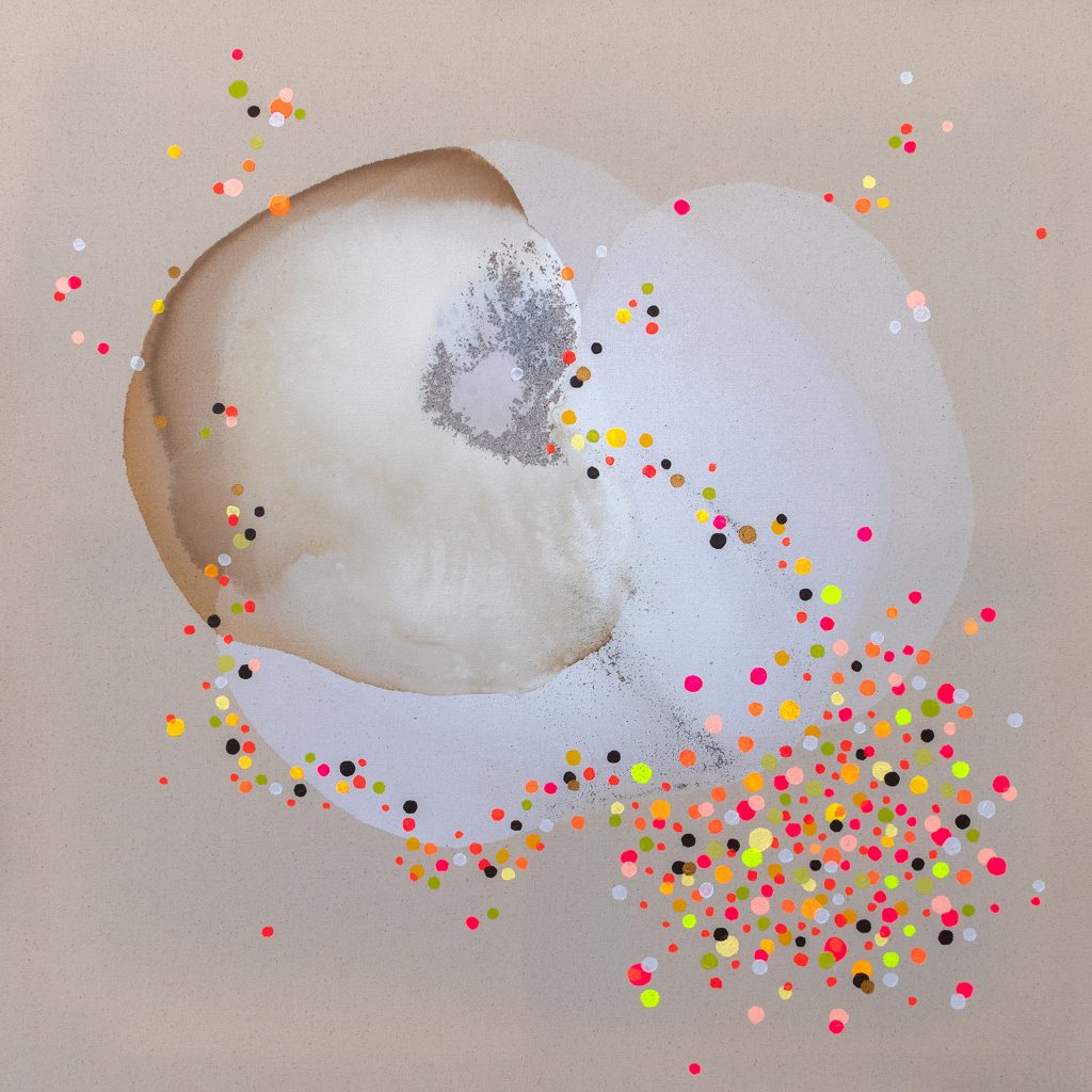 Die leuchtenden Farbpunkte – alle einzeln mit dem Pinsel gesetzt – stehen für Endorphine, für Energie und den entscheidenden Moment, in dem wir aus der eigenen Blase ausbrechen und den Betrachte in einen regelrechten Farbrausch versetzt.